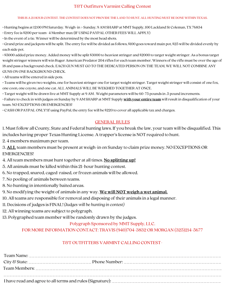 Team Entry 4 Member Max T&T OUTFITTERS FEBUARY 18TH & 19TH 2023 ← BackThank you for your response. ✨ Team Name(required) Warning Email(required) Warning Phone(required) Warning Name 1 (required) Warning Name 2 Warning Name 3 Warning Name 4 Warning Warning. SubmitSubmitting form Δ Varmint Hunt Team Entry Fee$220.00